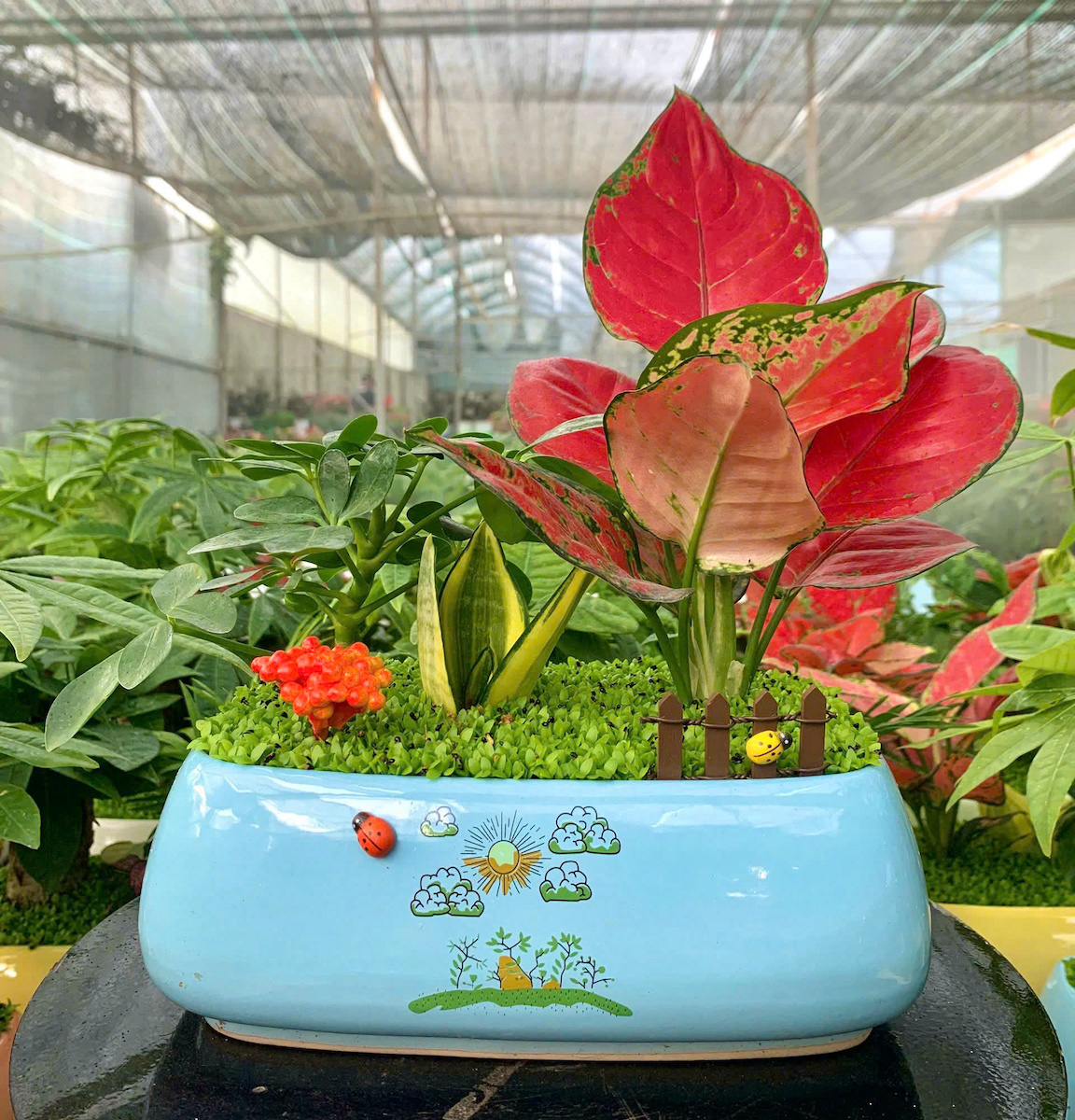 Bên cạnh Kim tiền, Kim ngân, Cây Si, … Vạn lộc thái là loại cây rất dễ chăm sóc, có sức sống mạnh mẽ. Điểm nổi bật nhất là bộ lá rực rỡ, sang trọng với màu đỏ rực tượng trưng cho sự may mắn, hỷ sự và năng lượng tích cực. Vì thế mẫu “Thuận buồm xui gió này” rất thích hợp để trang trí bàn làm việc, bàn hợp, phòng khách, quầy thu ngân, … hay làm quà tặng cho sếp, bạn bè, người thân, … đặc biệt là dịp Tết đến xuân về.