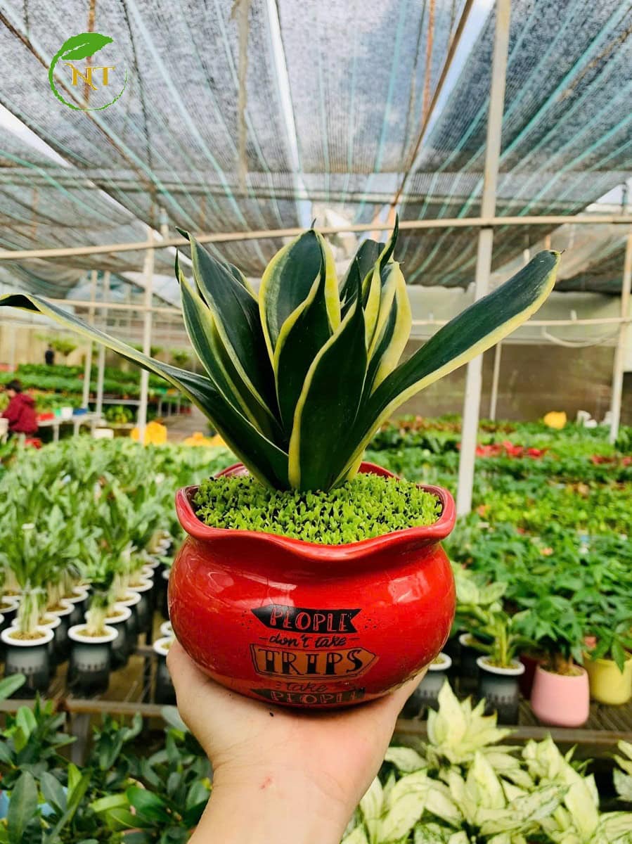 Chậu cây Lưỡi mèo xanh tròn miệng loe hoa văn nền cỏ