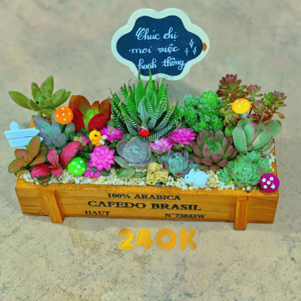 Chậu gỗ mộc mạc kết hợp với sen đá xương rồng đầy màu sắc mang đến một khu vườn vừa ấm cúng vừa rực rỡ mang đến cảm giác vui tươi và hạnh phúc. Đây là món quà ý nghĩa, đầy yêu thương với giá “nhẹ nhàng”, ngoài ra nếu đang tìm một chậu cây nhỏ decor nhà cửa theo phong cách gỗ, cổ điển hoặc các quán cà phê theo phong cách “chill”, gần gũi thiên nhiên thì đừng bỏ lỡ mẫu này nhé.