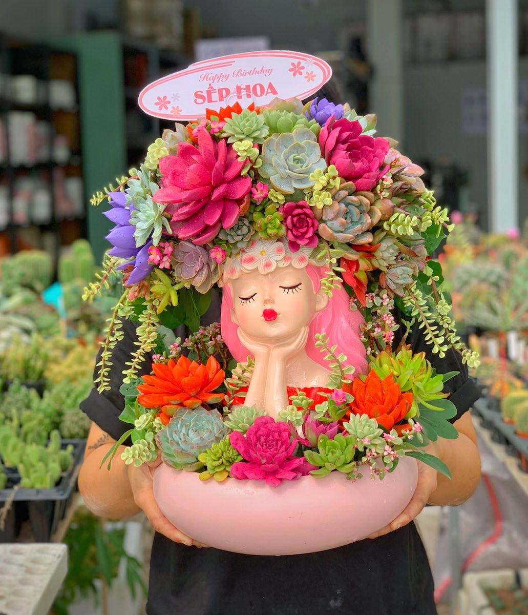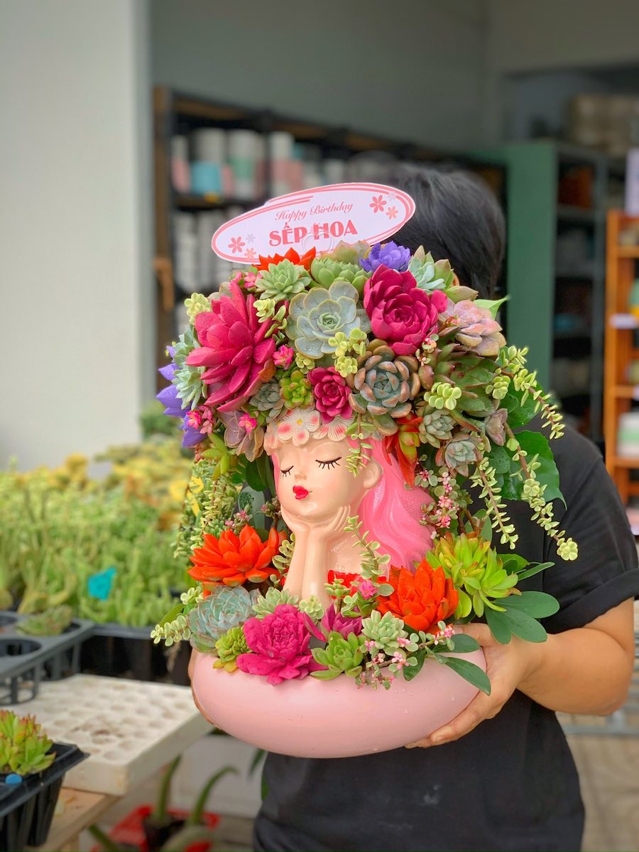 - Thiết kế lộng lẫy: Tập hợp đa dạng các loại sen đá, xương rồng mini với màu sắc Hồng, Đỏ, Xanh Ngọc rực rỡ, được sắp đặt tỉ mỉ tạo nên một “chiếc vương miện” kiêu sa cho Nàng Thơ.